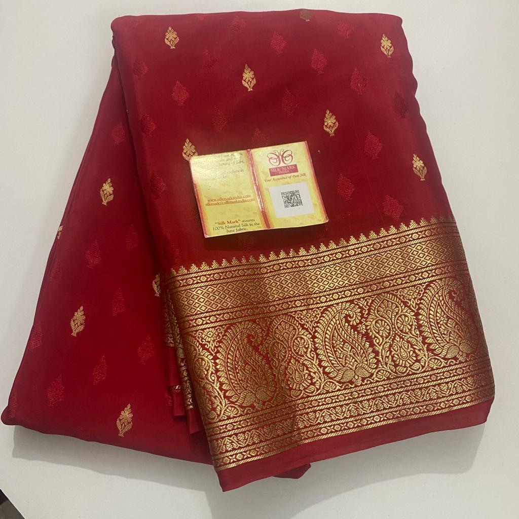 Mysore silk saree is a solid colour base fabric made with 100% pure silk. The smooth texture of Mysore silk keeps you comfortable and gives you a regal look.